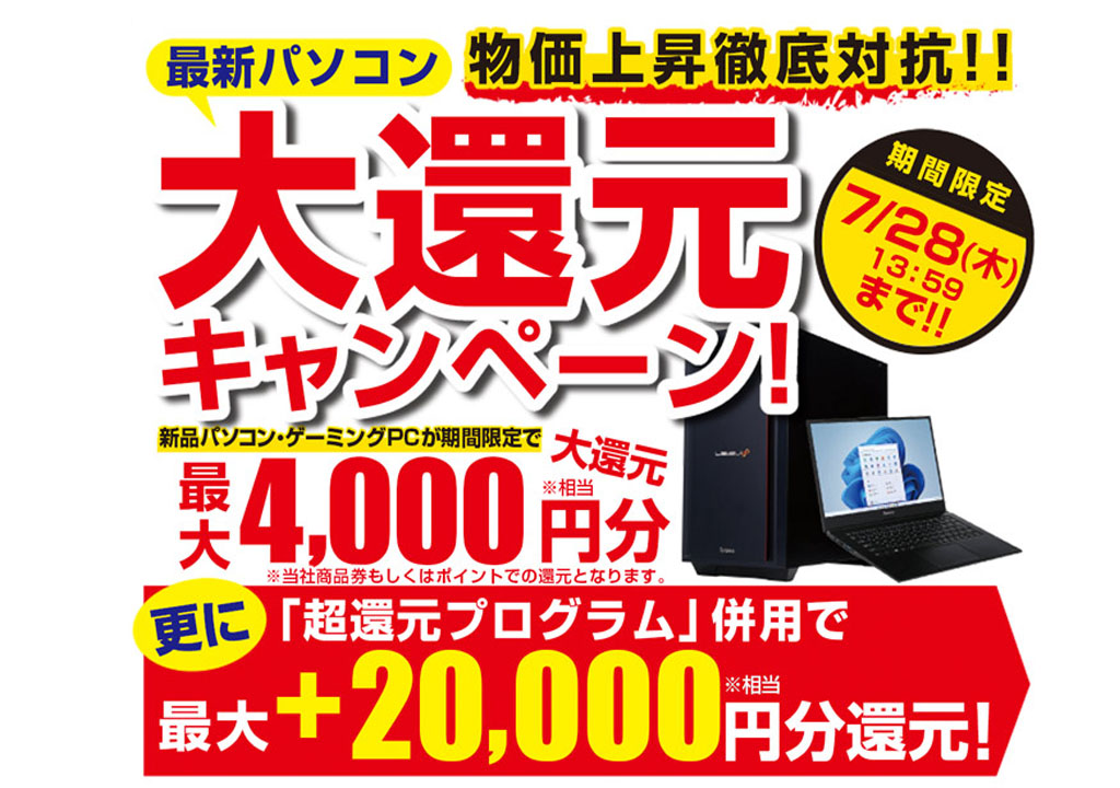 18 7月 キャンペーン 最新パソコン 大還元キャンペーン 2022年7月18日 By pcnorthec_admin パソコン工房インターネット通販サイトでは、7月28日(木)13:59までの期間限定で、BTOパソコンのご購入に応じて最大4,000円分相当のポイントを還元するお得なキャンペーン「最新パソコン 大還元キャンペーン」を開催中です。...Continue reading